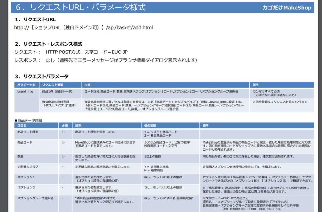 Makeshopのカートへ送るリクエストのうち、商品データ部分の仕様書がこれ。